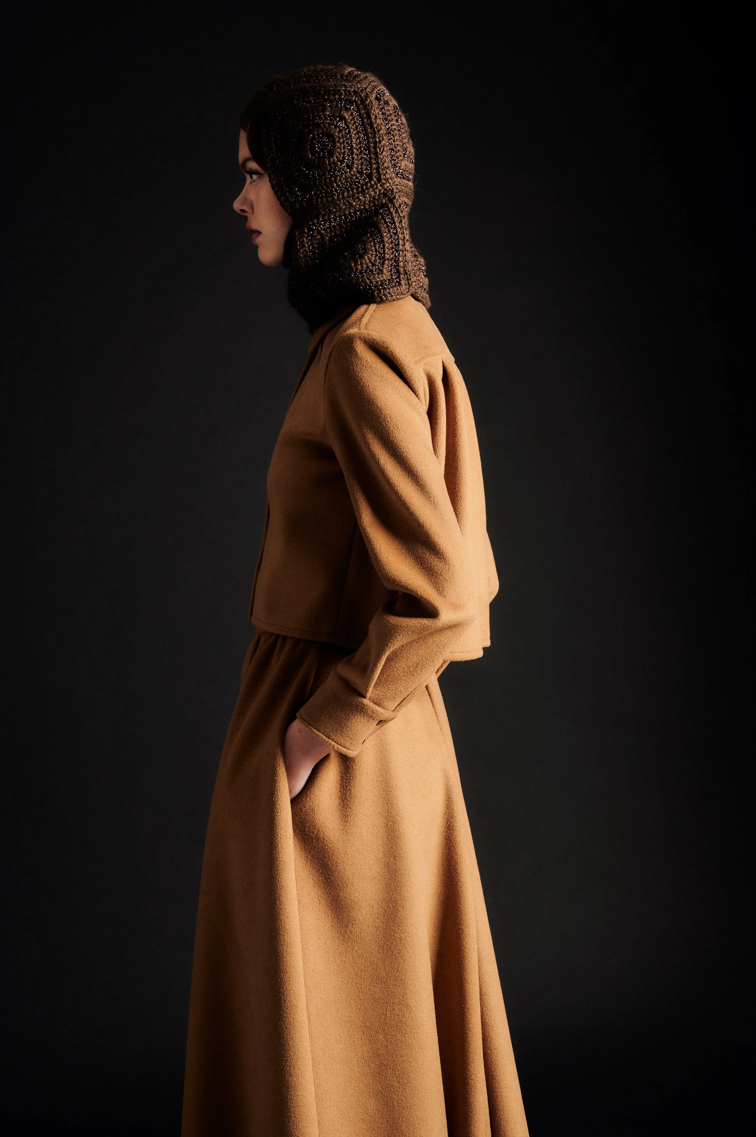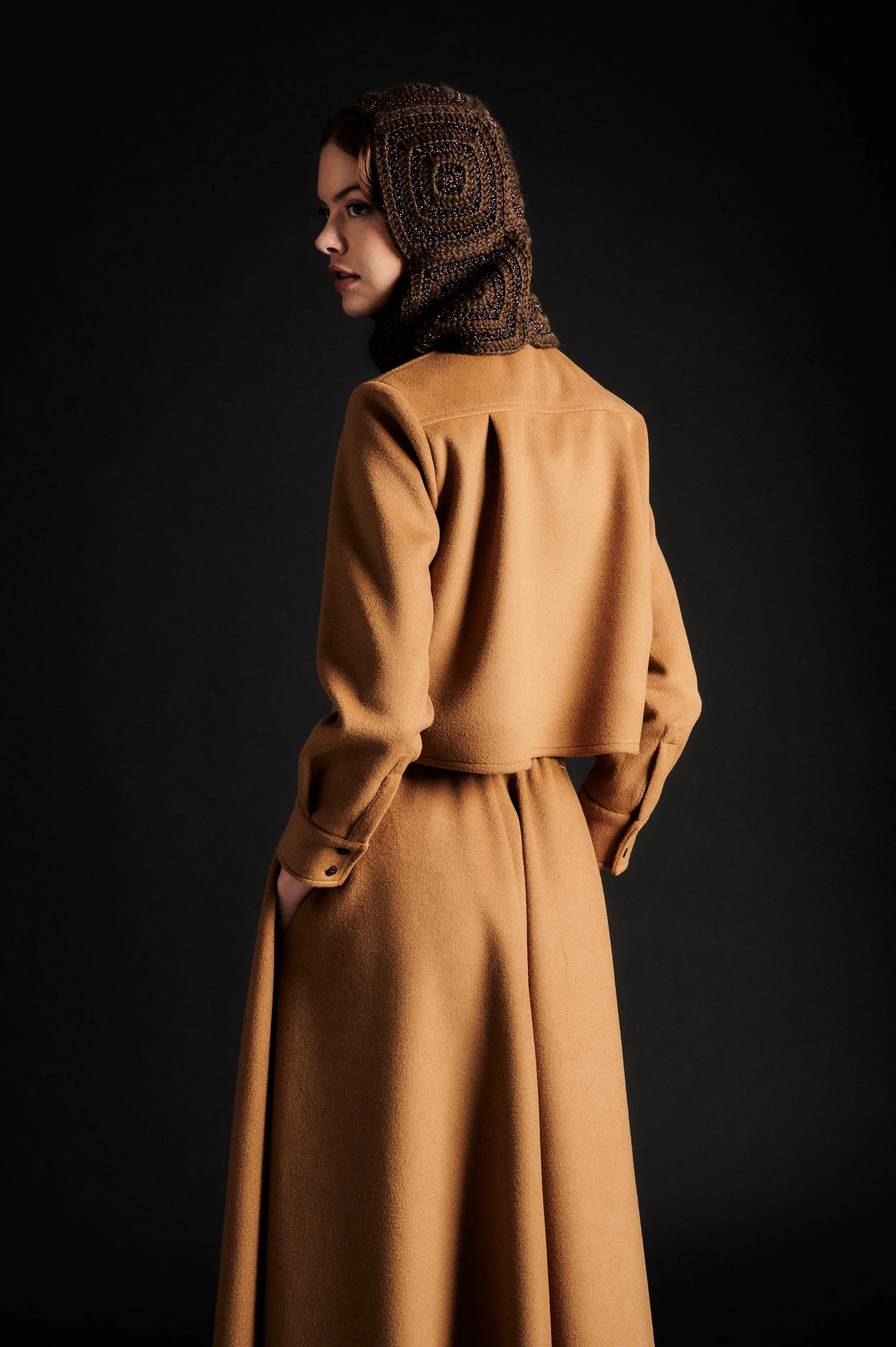 Camel wool shirt, straight and short volume.